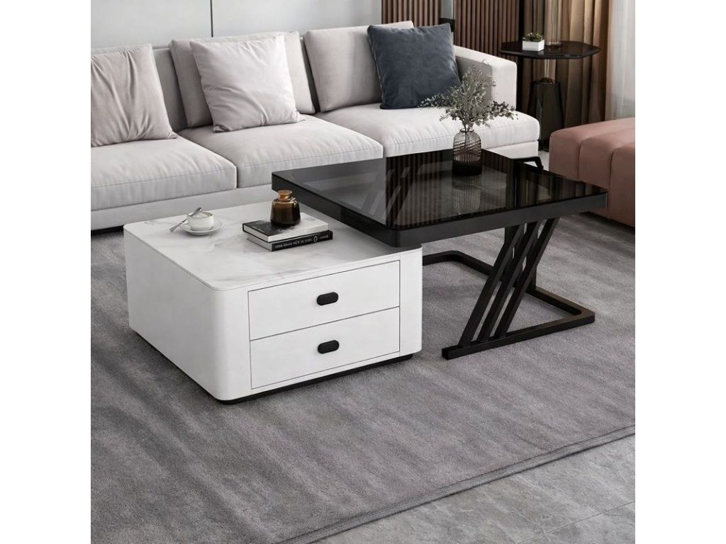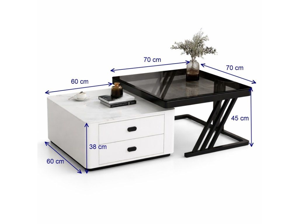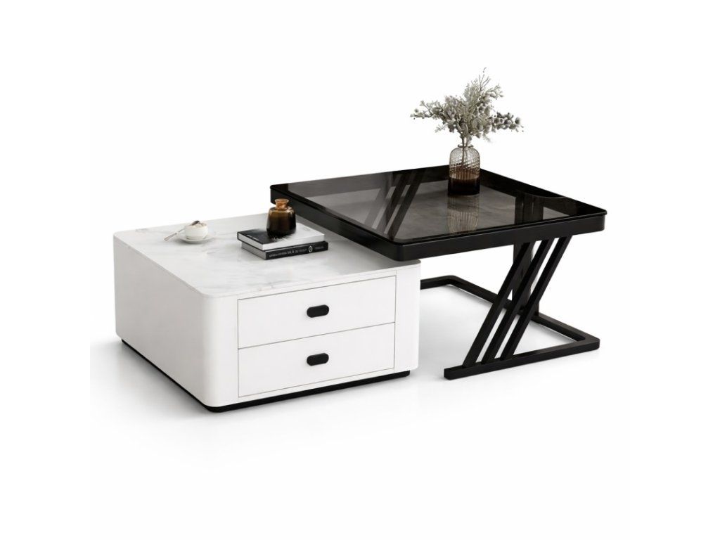Der kleinere Tisch ist mit zwei praktischen Schubladen ausgestattet, die ausreichend Stauraum für Kleinigkeiten, Fernbedienungen oder Zeitschriften bieten und dabei helfen, den Wohnbereich ordentlich und übersichtlich zu halten.