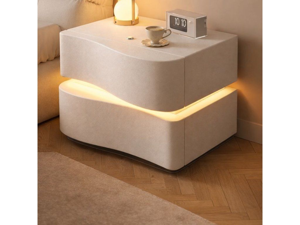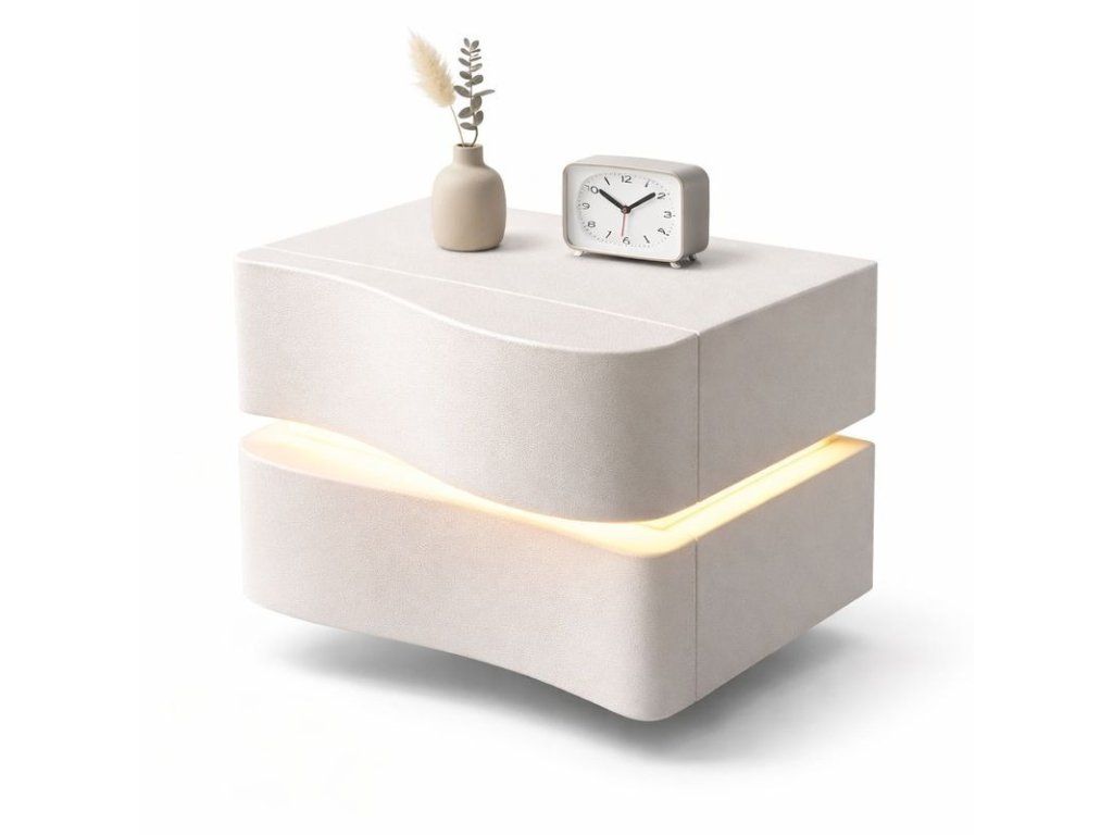 Der moderne Nachttisch ALVA mit LED-Beleuchtung ist ein elegantes und praktisches Möbelstück für das Schlafzimmer, das stilvolles Design, Funktionalität und eine angenehme Atmosphäre vereint. Dank seiner originellen Form und der dezenten LED-Beleuchtung wirkt der Tisch besonders hochwertig und schafft zugleich ein stimmungsvolles Ambientelicht für entspannte Abendstunden.