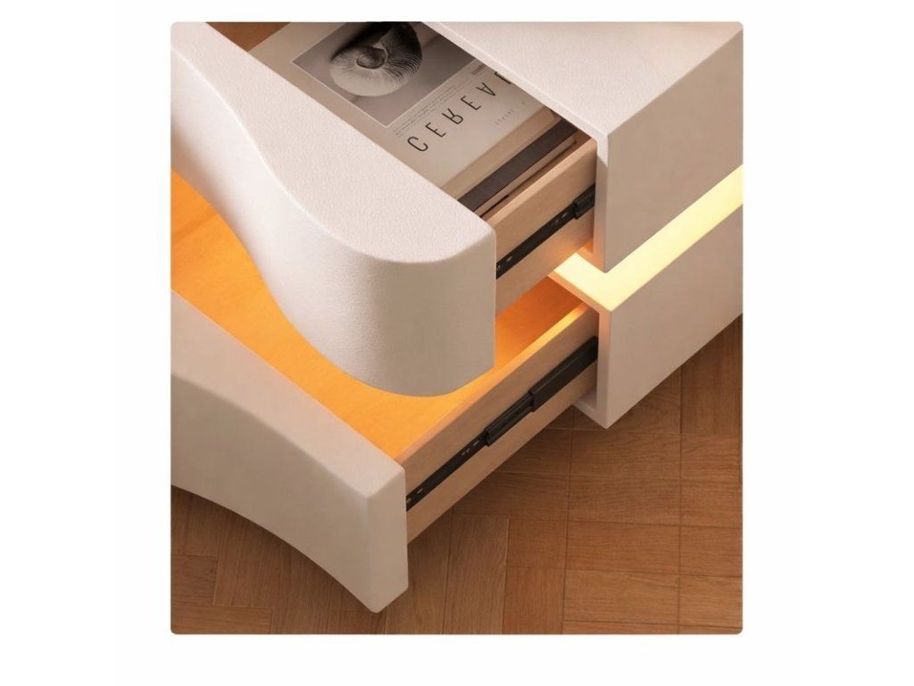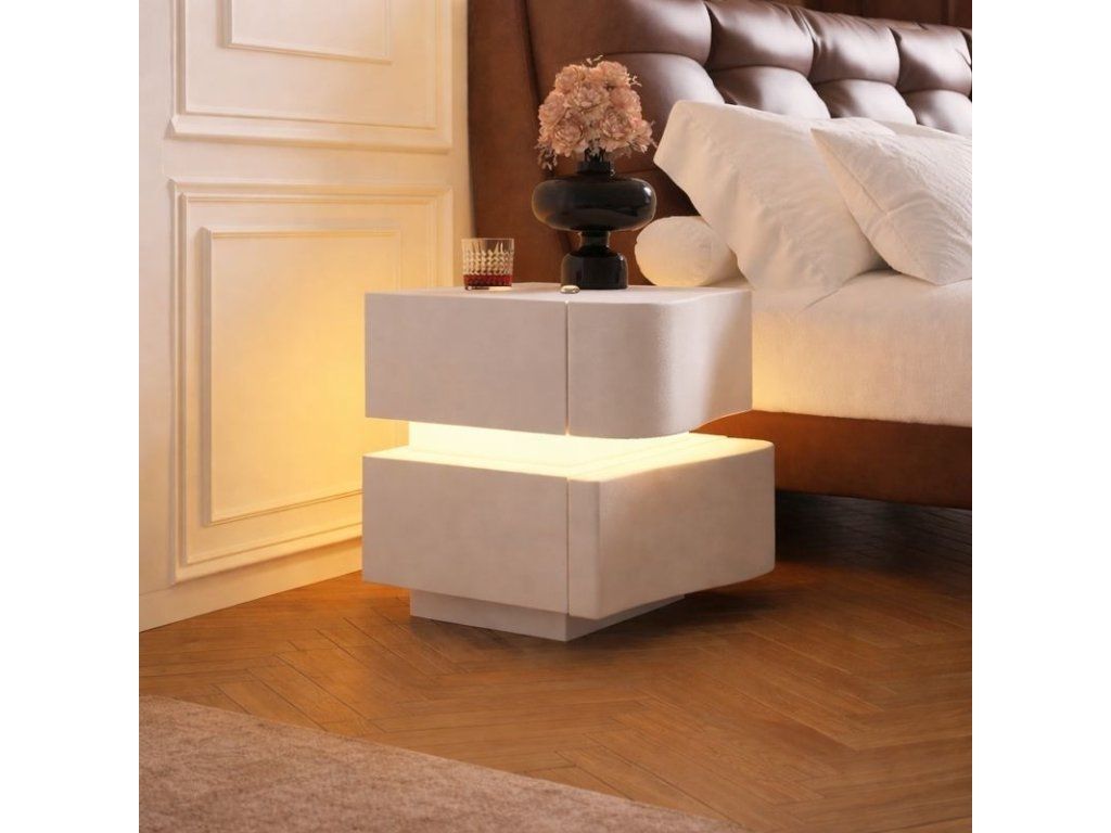 Das moderne Design wird durch die integrierte LED-Beleuchtung ergänzt, die ein sanftes Licht zwischen dem oberen und unteren Teil des Nachttisches erzeugt. Dieses Licht sorgt nicht nur für eine stilvolle Optik, sondern kann auch als dezentes Orientierungslicht im Schlafzimmer dienen.