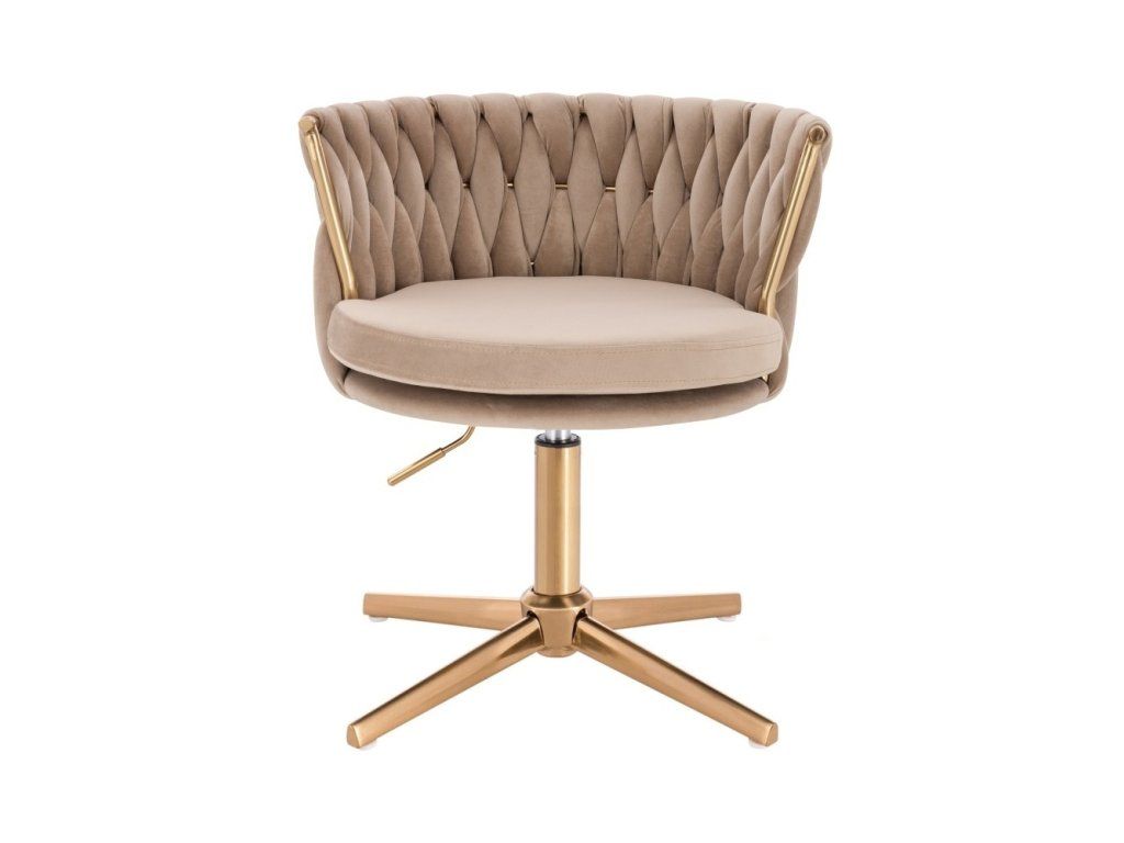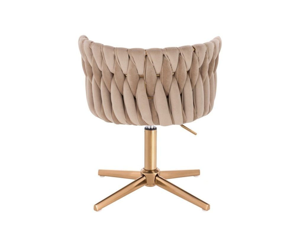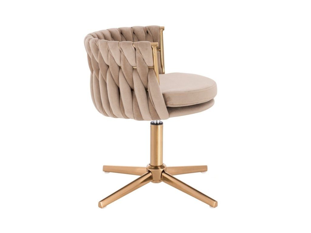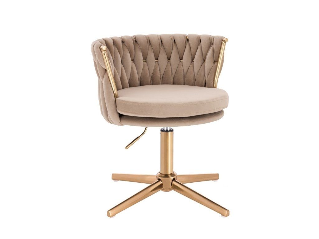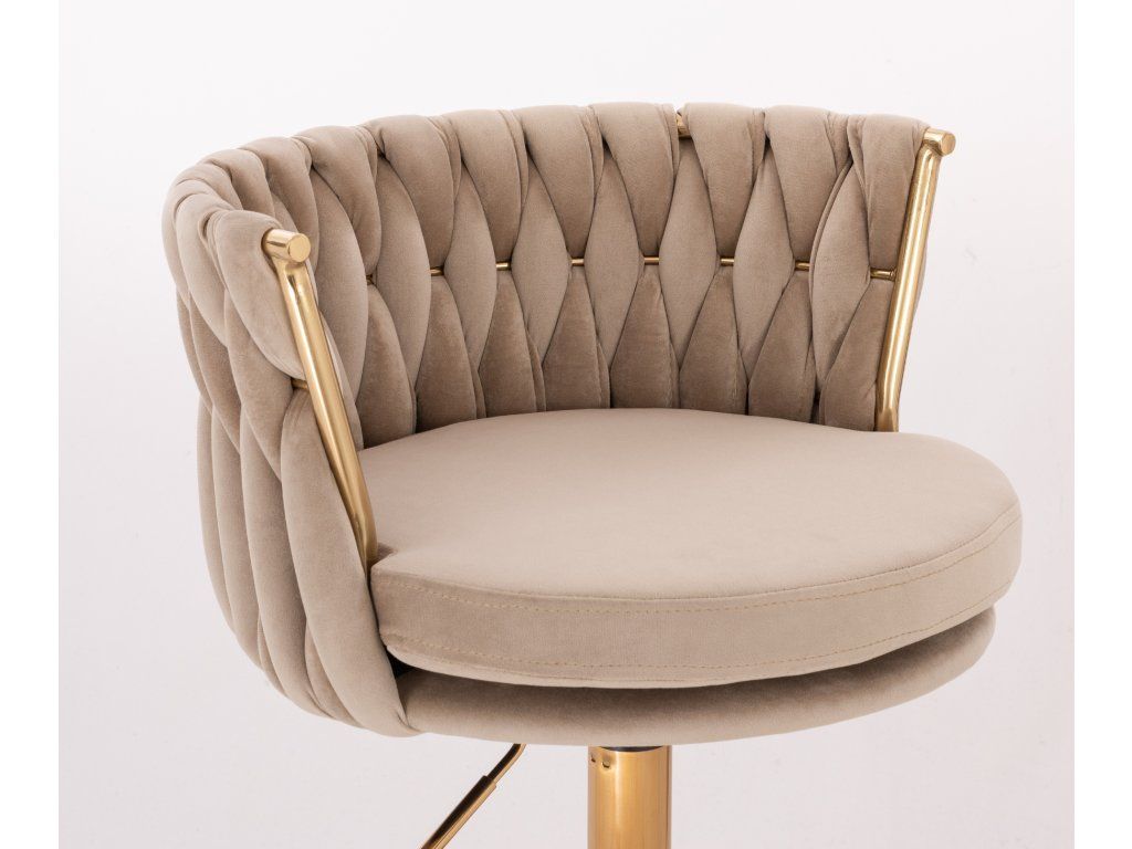 Die komfortabel gepolsterte Sitzfläche ist mit hochwertigem Velours bezogen, der sich angenehm velours-weich anfühlt. Die stabile Metallbasis mit goldenem Fußkreuz sorgt für sicheren Stand und eine zuverlässige Nutzung im Alltag.