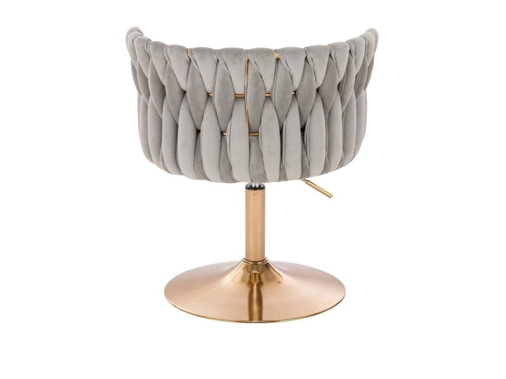 Die komfortabel gepolsterte Sitzfläche ist mit hochwertigem Velours bezogen, der sich angenehm velours-weich anfühlt. Die stabile Metallbasis mit goldenem Tellerfuß sorgt für sicheren Stand und eine zuverlässige Nutzung im Alltag.