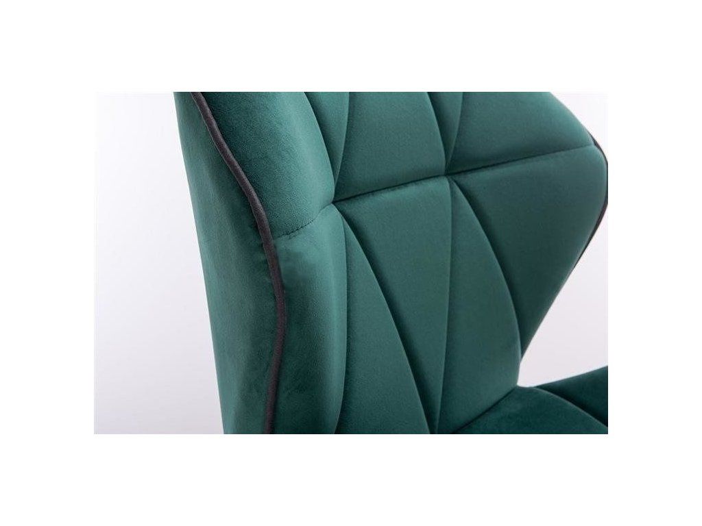 Sitzfläche und Rückenlehne sind komfortabel gepolstert und mit hochwertigem, gestepptem Velours bezogen. Das geometrische Steppmuster sowie die kontrastierenden Kanten verleihen dem Stuhl eine stilvolle und moderne Ausstrahlung.