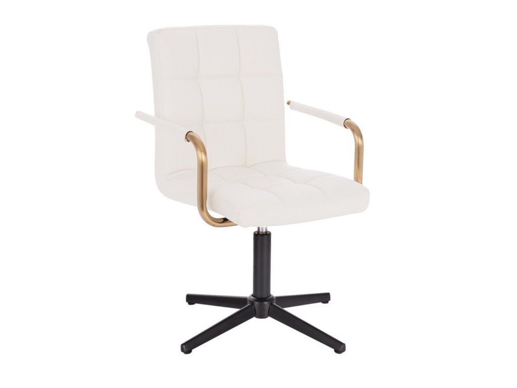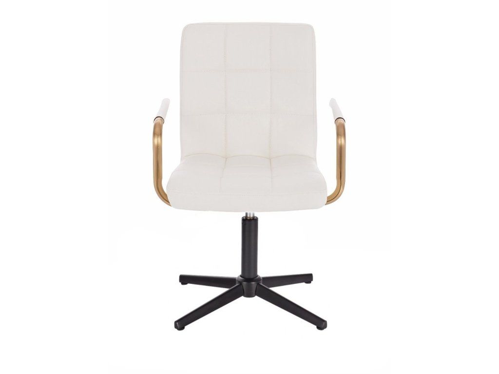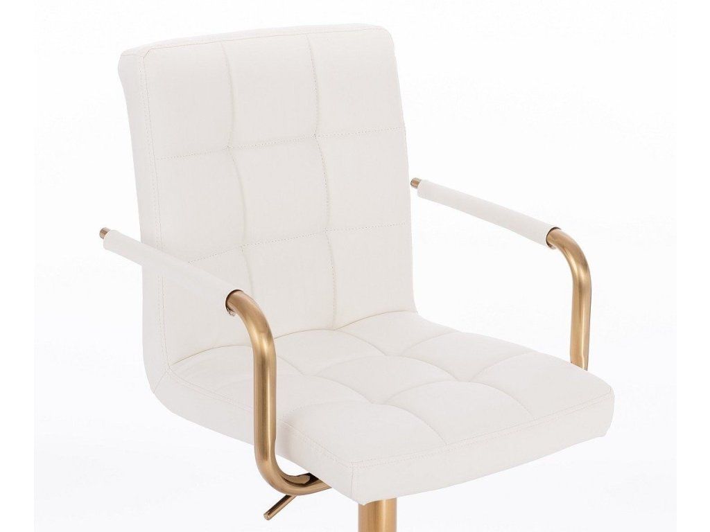 Sitzfläche und Rückenlehne sind mit gestepptem Kunstleder bezogen. Das Material ist pflegeleicht, strapazierfähig und lässt sich besonders einfach reinigen. Elegante goldfarbene Armlehnen verleihen dem Stuhl eine luxuriöse Optik und setzen stilvolle Akzente.