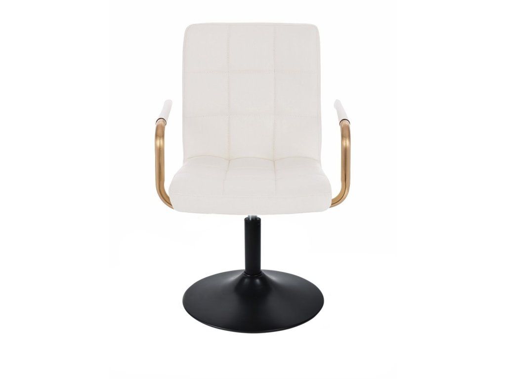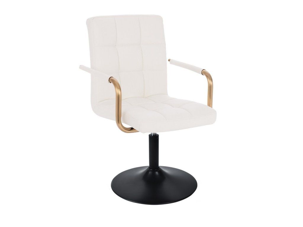 Sitzfläche und Rückenlehne sind mit gestepptem Kunstleder bezogen. Das Material ist pflegeleicht, strapazierfähig und lässt sich besonders einfach reinigen. Elegante goldfarbene Armlehnen verleihen dem Stuhl eine luxuriöse Optik und setzen stilvolle Akzente.