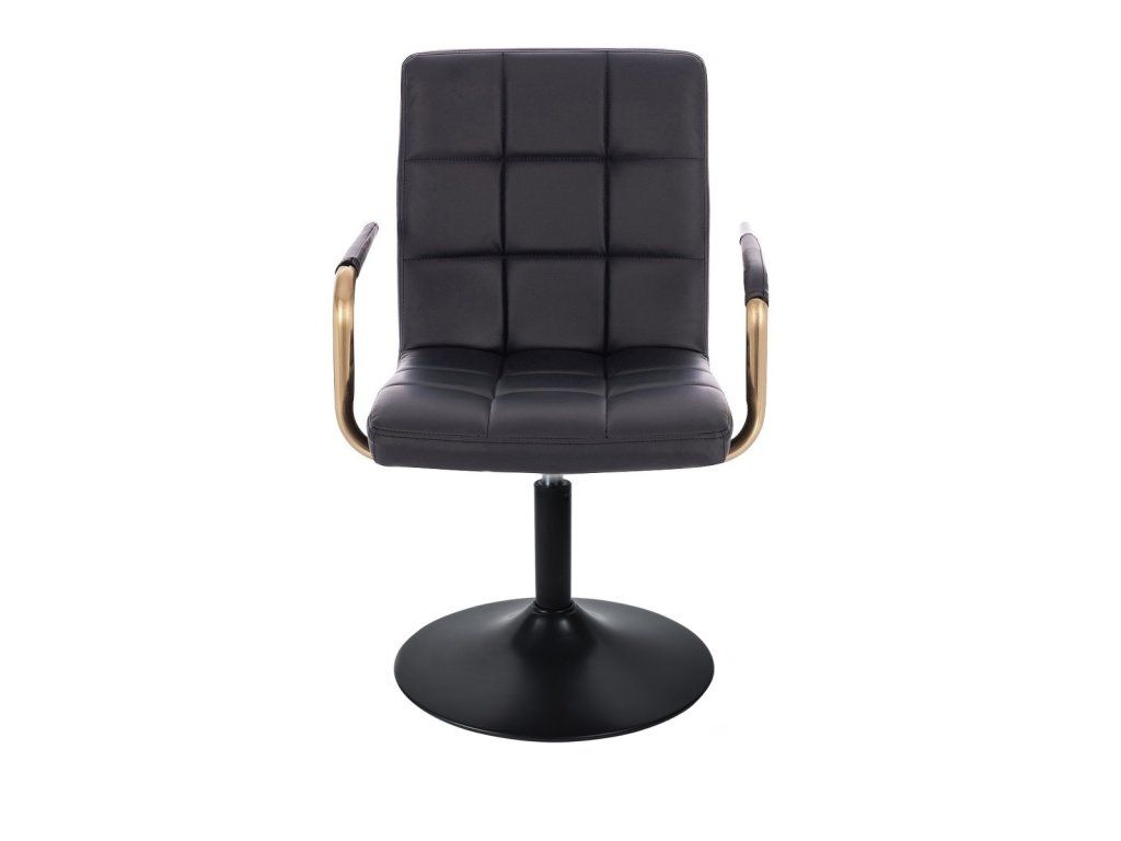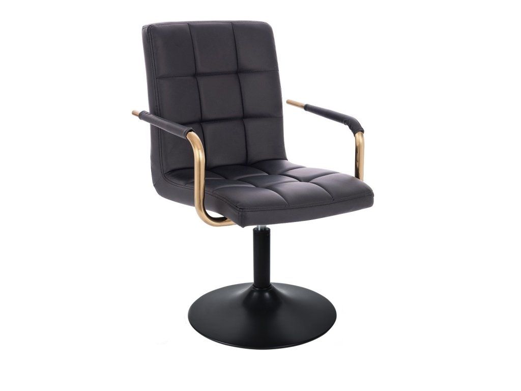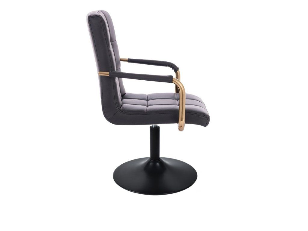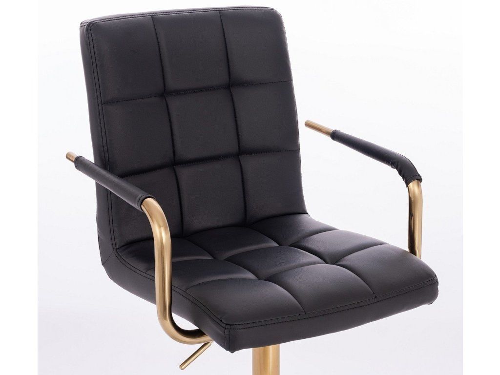 Sitzfläche und Rückenlehne sind mit gestepptem Kunstleder bezogen. Das Material ist pflegeleicht, strapazierfähig und lässt sich besonders einfach reinigen. Elegante goldfarbene Armlehnen verleihen dem Stuhl eine luxuriöse Optik und setzen stilvolle Akzente.